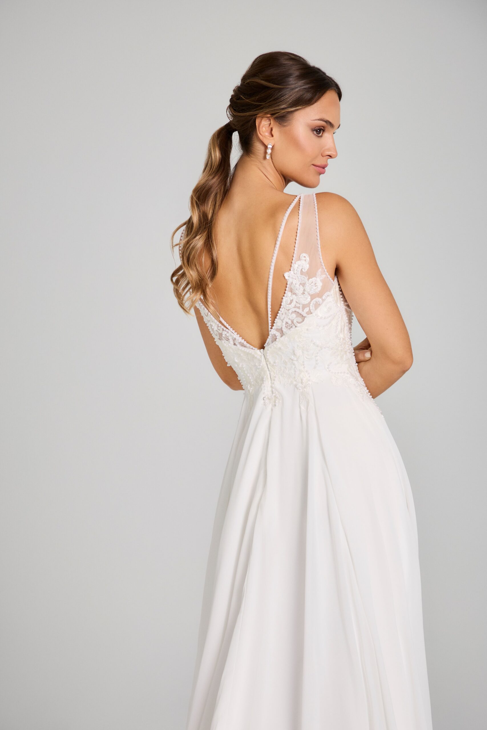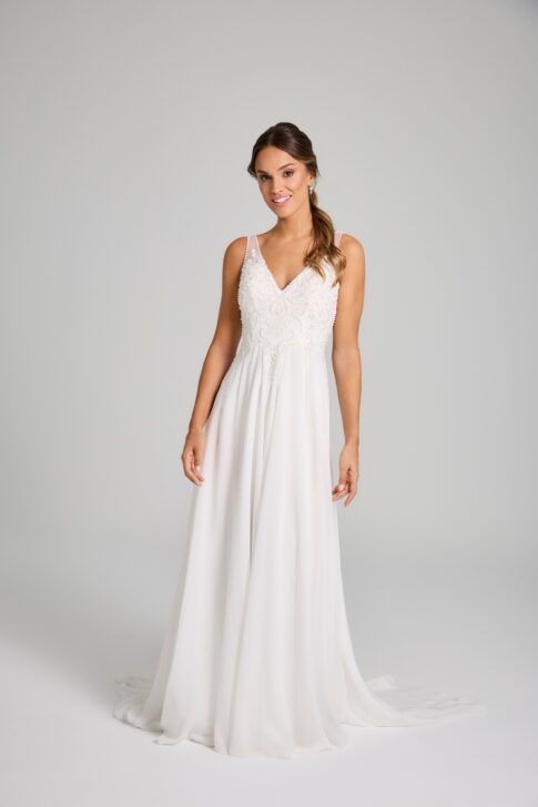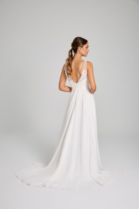 Vestido de novia Nadia de Innovias con cuerpo ajustado a la cintura con bordados de perlas y espalda cruzada baja con falda caida de gasa y apertura en la pierna